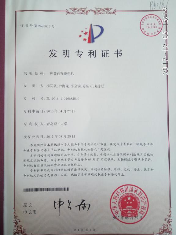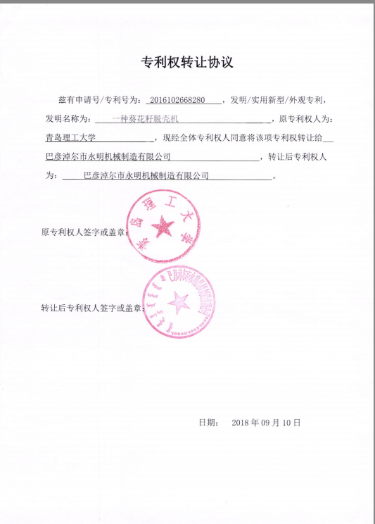 近日,机械与汽车工程学院学生发明专利首次成功实现转让,标志着学院学生科技创新成果实现了向现实生产力的转化。此次转让的是2013级机械设计制造及其自动化专业学生尹海龙、李全满等人于2016年申报的专利“一种葵花籽脱壳机”,成功转让给内蒙古一家专门从事葵花籽清选与脱壳的机械制造企业。