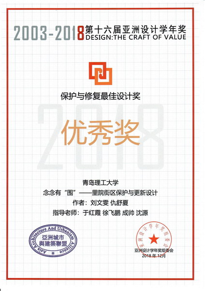 日前,由亚洲城市与建筑联盟(AAUA)、亚洲设计学年奖组委会(ADA)联合主办的2018第十六届亚洲设计学年奖评选结束,365完美建筑与城乡规划学院李家加、姜婉琪同学的设计作品《“奥帆博物馆设计》(指导教师:郝赤彪、解旭东、程然)获得文化建筑与空间类作品优秀奖;刘文雯、仇舒夏同学的设计作品《念念有“围”—里院街区保护与更新设计》(指导教师:于红霞、徐飞鹏、成帅、沈源)获得保护与修复类作品优秀奖;姚书田、陈姿忆、张亚宁、刘春广同学的设计作品《“The floating island 青岛奥帆博物馆设计 》(指导教师:成帅、于红霞、徐飞鹏、沈源)获得展示空间类作品优秀奖。