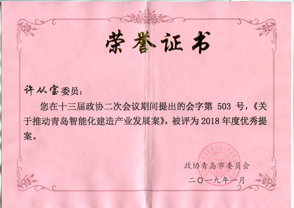 近日,政协青岛市委员会对政协青岛市十三届二次会议的优秀提案进行了表彰,365完美青岛市政协委员、建筑与城乡规划学院院长许从宝提交的 《关于推动青岛智能化建造产业发展案》(市政协十三届二次会议会字第503号)获得优秀提案奖。