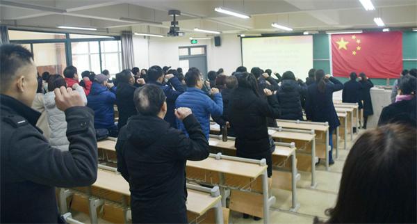 最后,全体教职工在国旗下庄严宣誓:忠诚党的教育事业,贯彻党的教育方针,履行教师神圣职责。修身立德,为人师表;追求真理,崇尚科学;敬业爱生,教书育人;淡泊名利,严谨治学;传承文明,勇于创新;终身学习,不断进步。为全体学生美好未来奉献全部智慧和力量!(撰稿:缪玉松;审核:邹传波)