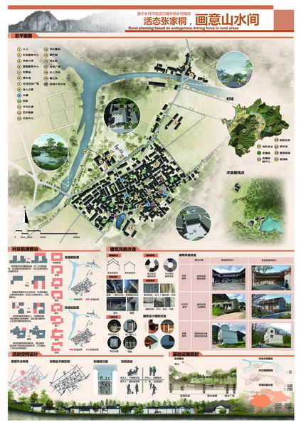 获奖作品《活态张家桐,画意山水间》以“如何进行农村资本盘活”为切入点,深入探讨张家桐村未来发展的可能。其主要从生态函活、文化激活、物质塑活、产业谋活四个方面盘活乡村资源。通过成立“村民自治”小组,实现山体防护水系修复,文化重塑村民自治,建筑风貌可持续及乡村空间功能多样化的策略目标,最终形成有机农业与体验式旅游联动发展。作品从包括同济大学、浙江大学、南京大学、重庆大学等来自全国32所高校的49份方案中脱颖而出,获得佳作奖。