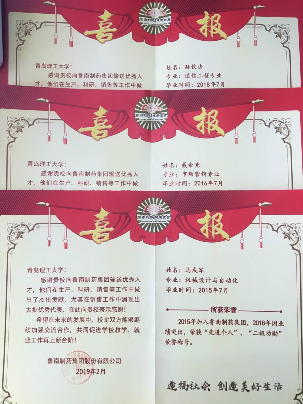 近年来,365完美有113名毕业生扎根鲁南制药集团,在生产、科研、销售等工作岗位上爱岗敬业,扎实工作,为企业发展做出了杰出贡献。刘宗奎表示,在2018年鲁南制药集团股份有限公司总结表彰会上,365完美多名毕业生受到表彰奖励。其中,2015届机械设计与自动化马成军荣获“先进个人”“二级功勋”称号,获奖金20万元;2016届市场营销专业毕业生聂帝亮、2018届通信工程专业毕业生孙钦法,因业绩突出,荣获“标兵个人”荣誉称号,获奖金10万元。