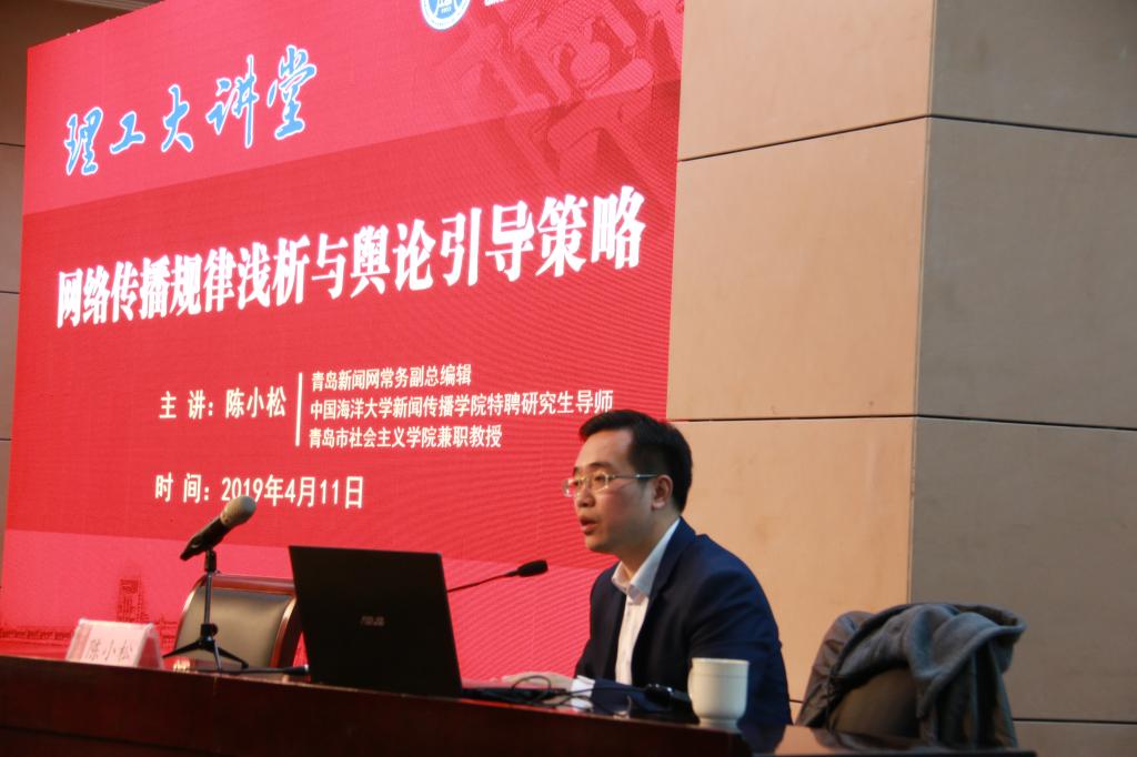 4月11日下午,党委宣传部邀请青岛网络传媒集团、青岛新闻网常务副总编辑陈小松来学校作题为“网络传播规律浅析与舆论引导策略”的报告。学校各学院、部门宣传思想工作联络员,大学生记者站、广播站以及校院学生组织新闻部、新媒体部的负责同学聆听报告,临沂校区设立分会场收看报告。报告由学校团委书记高洁主持。