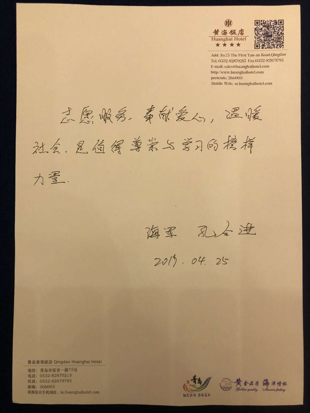 4月24日下午,校团委书记高洁和团市委志工部部长李耀贤,一同来到青岛黄海饭店深入了解志愿服务工作情况,向志愿者们表达了亲切的慰问,并对志愿者们的辛勤付出给予了充分肯定。高洁指出,志愿服务是当代青年运动时代主题的生动实践,希望志愿者要珍惜宝贵的实践机会,提高政治站位、强化大局意识和责任担当,在纪念五四运动100周年之际,将志愿者精神、五四精神融入到本次志愿服务过程中,凝聚成一股股正能量,用实际行动为青岛争光、为海军节添彩。