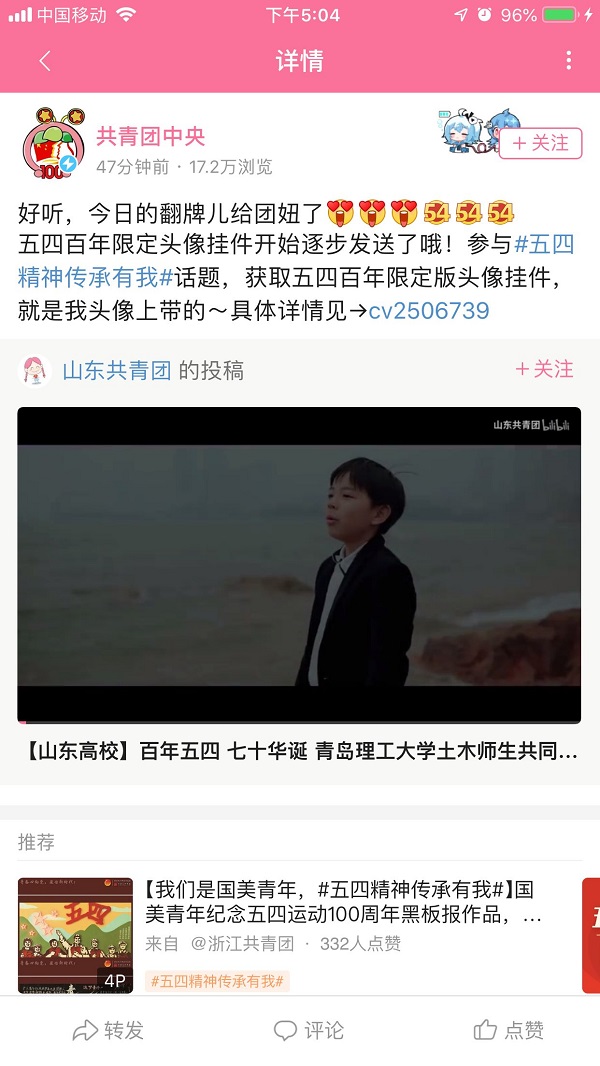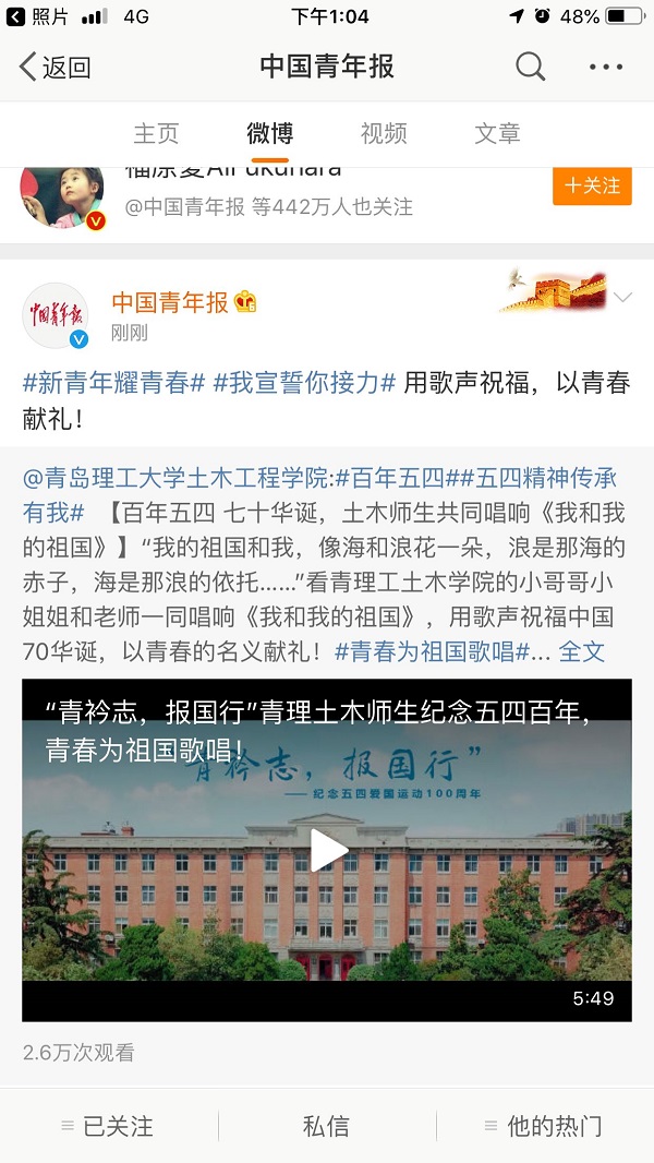 学院青年学生们共同挥舞国旗,用美妙的歌声,以昂扬的青春活力向祖国献礼。他们在石老人,五四广场,栈桥,校科技广场、教学楼、校史馆、礼堂等地以多样的形式,多彩的创意共同唱响《我和我的祖国》。五四广场上,五月的风伴随着悠扬的琴声,像是在诉说着对祖国爱得深沉;科技广场上,国旗护卫队步伐铮铮,鲜艳的五星红旗在空中迎风飘扬;校史馆门前,土木学子身着汉服翩翩起舞,弘扬中华民族优良传统;操场上同学们伴随着“我和我的祖国,一刻也不能分割,无论我走到哪里,都流出一首赞歌”的朗朗歌声,幸福和自信洋溢在每个人的脸上。视频在腾讯视频、新浪微博、微信公众号、QQ空间等新媒体平台同时上线后,受到了大家的广泛好评。截至5月4日下午18:00,视频已被共青团中央、中国青年报、中青网、中国大学生在线、山东共青团、山东省学生联合会、大众网、山东教育新闻网、共青团青岛市委、青岛日报、半岛都市报、齐鲁晚报、青岛财经日报、山东校园、青岛校园等校外媒体转载,累计播放量已达13.4万。