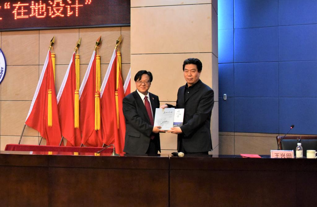 下午18:30,王兴田客座教授聘任仪式在学术报告厅举行,高俊伟院士为王兴田教授颁发聘任书,王兴田向学校赠予《博风汉骨》《在地设计》两本专著。