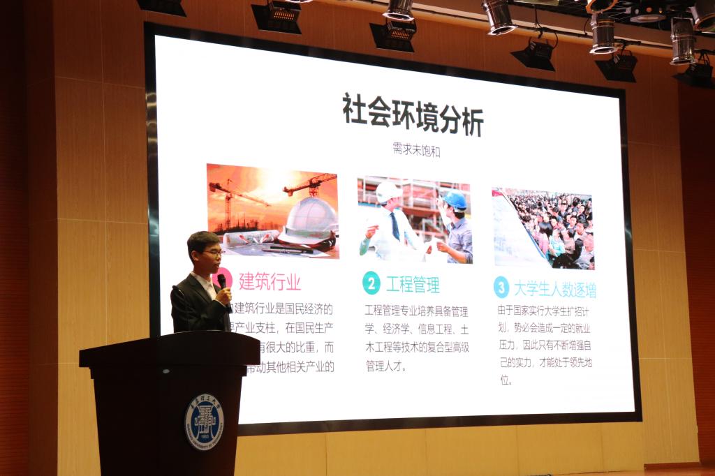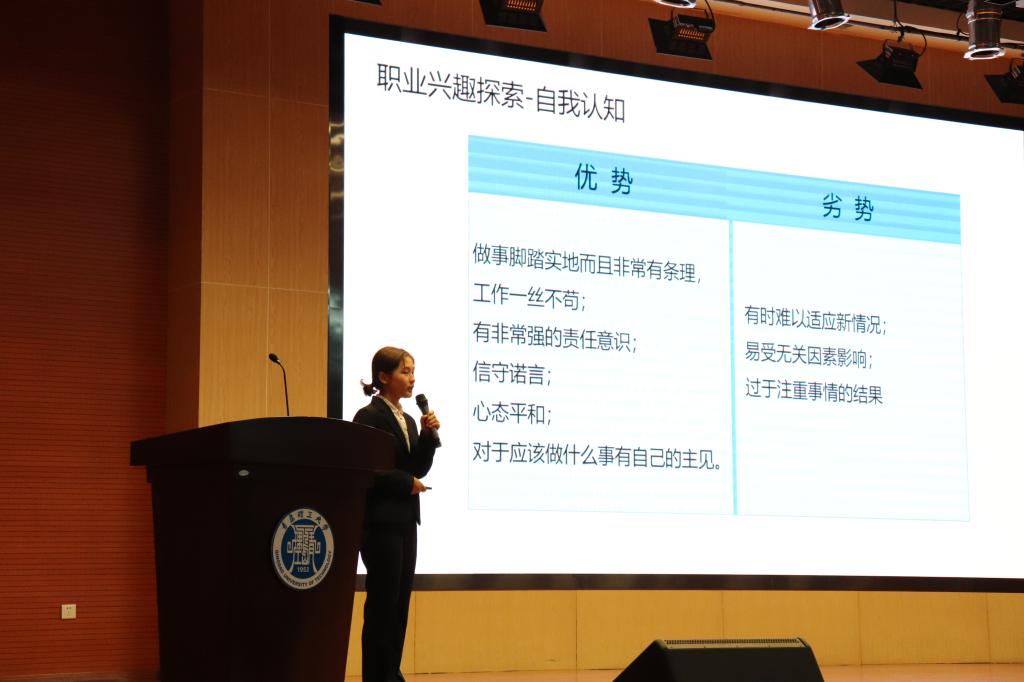本次大赛以“运筹帷幄,赢向未来”为主题,分初赛和复赛两个阶段,经过各环节筛选,最终10名选手脱颖而出进入决赛。决赛由主题陈述和现场答辩两个环节构成,在主题陈述环节,十位选手分别围绕目标职业,结合PPT展示,从自我认识、职业认知、行动计划与备选方案等方面作详细介绍。现场答辩环节,各评委通过性格分析、职业兴趣、社会环境、计划实施以及修正反馈等进行针对性的提问。整个比赛过程紧张有序,选手们的职业生涯规划设计结构完整、逻辑清晰、条理清楚、重点突出,生涯目标制定贴切合理,选手们机智和富有创造力的回答赢得了现场观众的阵阵掌声。