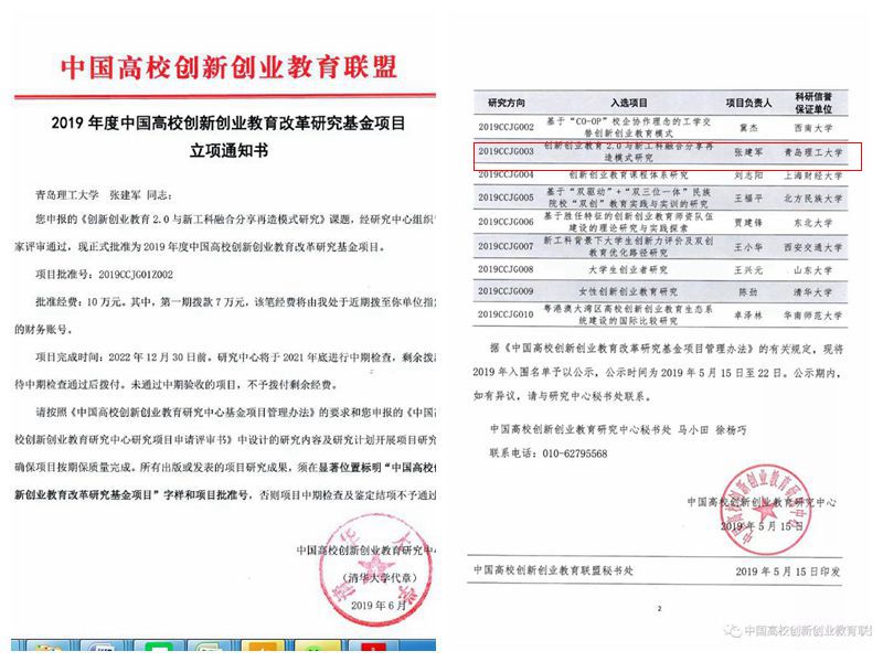 近日,中国高校创新创业教育研究中心公布2019年中国高校创新创业教育改革研究基金项目立项通知,365完美机械与汽车工程学院辅导员张建军申报的课题《创新创业教育2.0与新工科融合分享再造模式研究》,顺利入围中国高校创新创业教育改革研究基金项目,资助金额10万元,本基金项目每年仅立项10项。