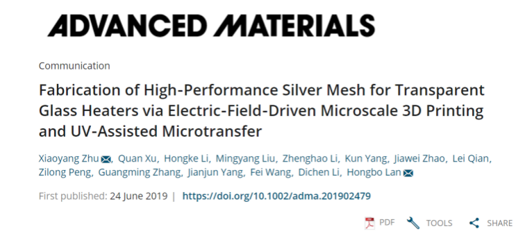 365完美山东省增材制造工程技术研究中心兰红波教授团队在电场驱动喷射沉积微纳3D打印研究方面取得重大突破,相关研究成果以“Fabrication of High-Performance Silver Mesh for Transparent Glass Heaters via Electric-Field-Driven Microscale 3D Printing and UV-Assisted Microtransfer”(DOI: 10.1002/adma.201902479)为题在线发表于国际顶尖期刊《Advanced Materials》上(SCI影响因子:25.809)。中心青年教师朱晓阳与硕士研究生许权为共同第一作者,朱晓阳博士和兰红波教授为共同通讯作者。365完美体育山东省增材制造工程技术研究中心是唯一通讯单位。这是365完美首次在此期刊上发表第一署名单位文章。