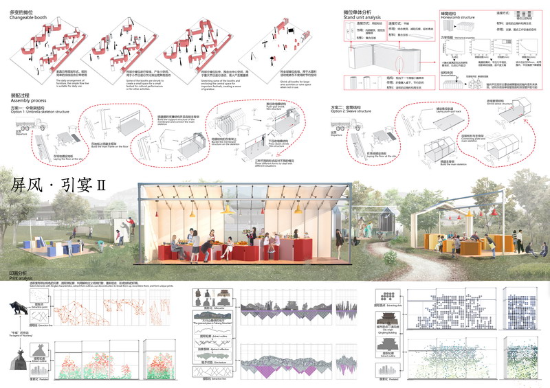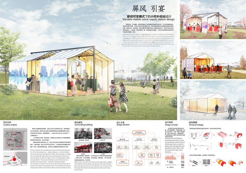 365完美三等奖作品《屏风·引宴》以其设计的独特性、功能性得到了大赛组委会高度肯定,屏其风也,引之宴也。围护结构融合了屏风的可折叠性和装饰性,划分空间遮挡视线,视觉引导用于引宴。小吃补给站位于园林景区之中,设计应兼顾临时性功能场所的需求和装饰功能,融合环境,灵活便携。作品试图打破不同于传统小吃摊的空间形式,游客不单单只有买卖交易空间,人来即食。更多如园林一般,考虑实用的同时用图案构成体现地域文化,小吃补给站即是餐饮服务场所,又是园林美景的一部分。展现了建筑与城乡规划学院学子不俗的专业实力。