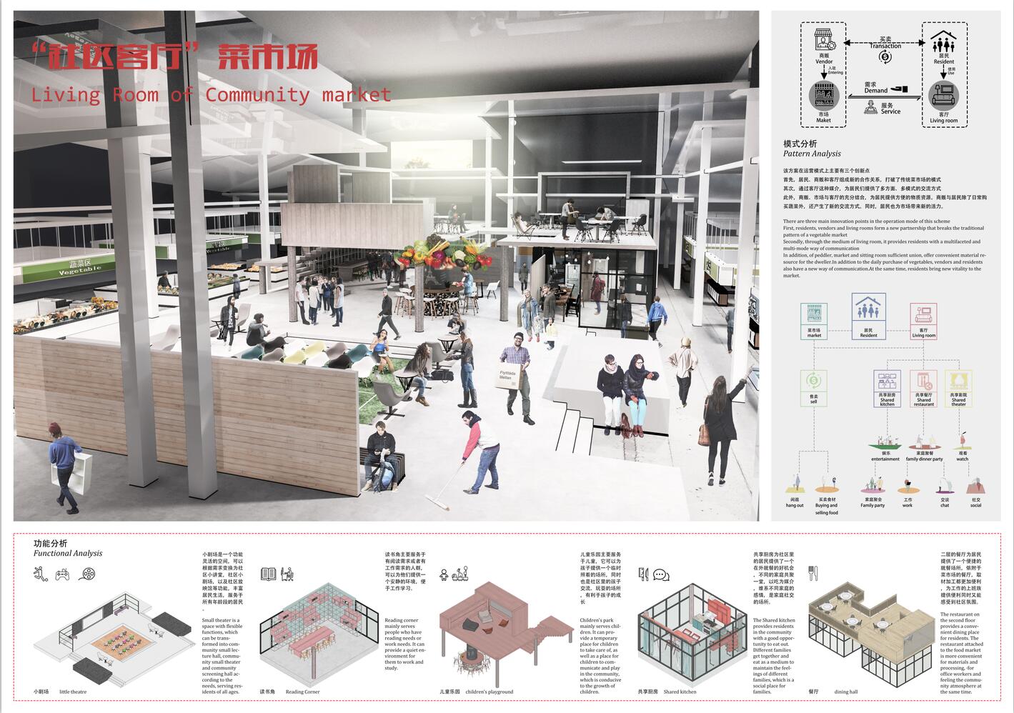 优秀奖作品《社区客厅—菜市场》旨在突出“城市生活的灵魂就是菜市场”,菜市场对于社区居民的意义,不仅仅是买卖食材,还是社区文化以及对社区居民的关切和尊重的体现,刻画出最真实、最有人情味的社区形象。本设计以增强社区居民生活体验,促进居民交流互动为出发点,将客厅空间与菜市场复合,营造一个有着浓厚社区感,充满温情与生活气息的空间。客厅在中国文化中,是一个家庭的门面,而客厅也是人们日常生活中使用最为频繁的空间,人们可以在客厅放松、娱乐、游戏、进餐等等,因而作为整个家庭的中心,是维系一个家庭的场所。而这个菜市场,作为居民的社区生活的触发器,紧紧地将社区居民联系在一起。