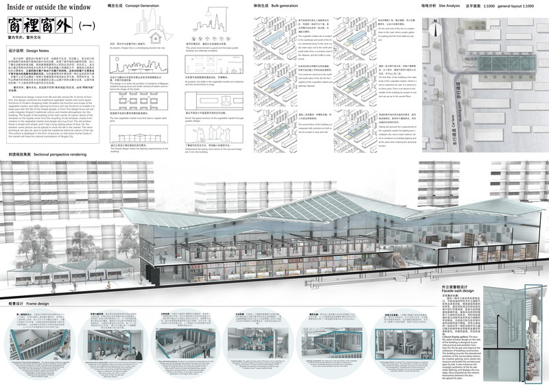 优秀奖作品《窗里窗外》旨在体现“窗内市井,窗外文化”这一概念,在这里不仅有“柴米油盐”的生活,也有“琴棋书画”的优雅。建筑设计来源于生活,也服务于生活。在功能上,设计结合传统菜市场和现代商场的部分空间功能,拓宽了菜市场的功能和范围,加入了餐饮功能和休息功能,使其能够紧跟邢台人民的生活步伐;在形式上,本次设计重点将邢台的传统文化和市井气息自然融入到建筑之中,建筑的立面是文化的主要载体。立面的部分窗户来自于旧窗户的回收,这些旧的窗户主要来自于菜市场内的商贩和买菜的市民。旧的窗框简洁朴素自带一种久远的的年代感,在窗户上还可以摆放一些照片来展现菜市场内的生活气息,同样的手法,也可以将城市的传统历史文化在建筑的立面上以图片的形式展示出来,让菜市场内的每一个人体会的邢台城市的文化内涵。