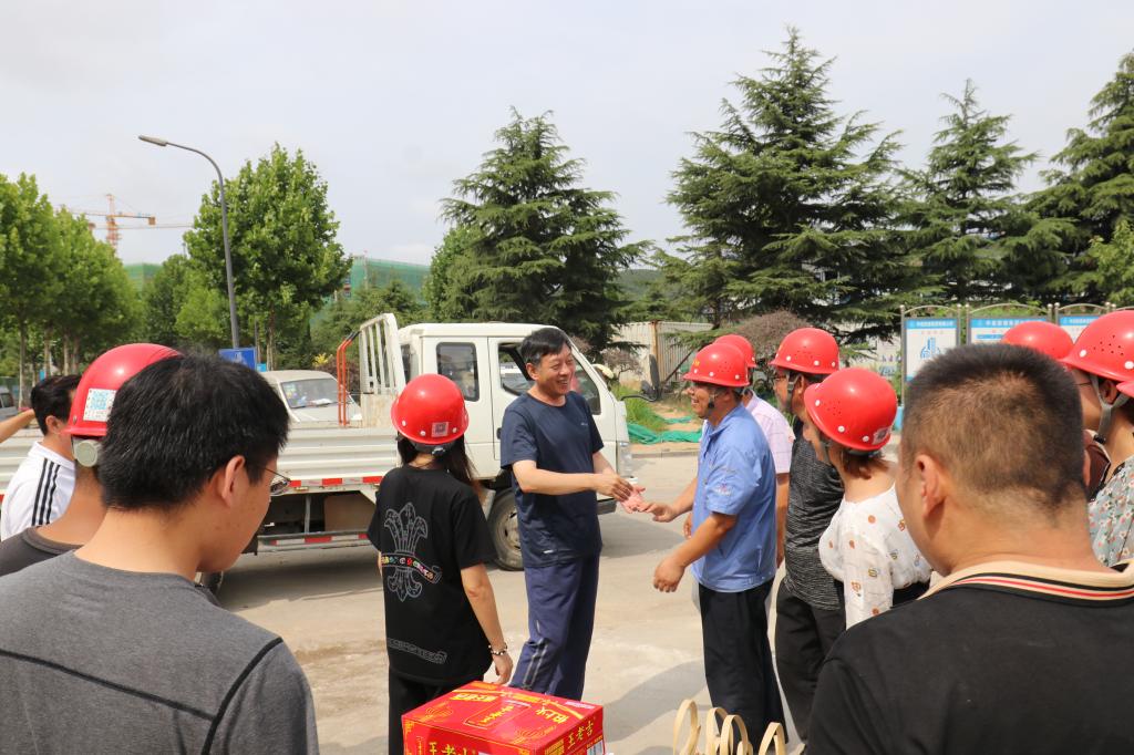 阮丁一行首先来到北区学生公寓和东部生活区等新校区项目施工现场,看望奋战在项目建设一线的施工人员,为他们送去了茶叶、矿泉水、毛巾、绿豆、肥皂等防暑降温物资。