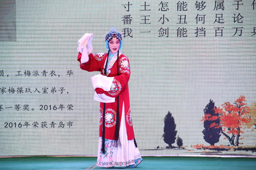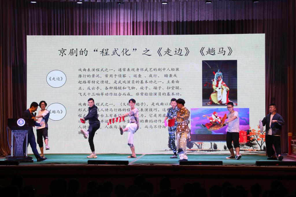 随后,《青少年京剧赏析》专场演出正式开始。青岛市京剧院副院长、国家二级演员巩发艺首先向同学们讲解了京剧的起源、四大徽班和“徽汉合流”的形成等基本知识。艺术家们各展绝活,为现场观众带来了一场京剧饕餮大餐。演员们表演了《定军山》《白蛇传》《穆桂英挂帅》《钓金龟》《铡美案》《芦花荡》《打龙袍—报花灯》等传统京剧片段,向同学们详细展现了“老生、小生、青衣、老旦、铜锤花脸、架子花脸、文丑”等各类京剧行当的发声技巧、表现形式及服装道具。优美的唱腔感人肺腑,铿锵的鼓点扣人心弦,五彩的戏服华丽炫目,精彩的演出赢得了现场阵阵热烈掌声。一曲由京胡演奏的《迎春》曲激情澎湃,京剧《起霸•下场花》和《秋江》分别展示了京剧“程式化”和“虚拟化”表演方式的特点。