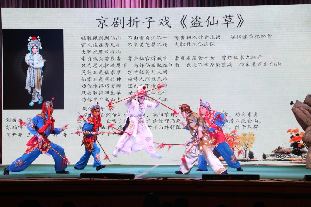 演员们还与同学们进行了现场互动教学,用多种方式和艺术载体对学生进行唱念欣赏、身段体验、表演互动、色彩内涵、服饰文化、历史知识、道德教育等多方面的传递和普及,让现场的青年学子在领略艺术大师风采的同时,也长了见识、学了知识。演出在传统剧目折子戏《盗仙草》中落下帷幕。