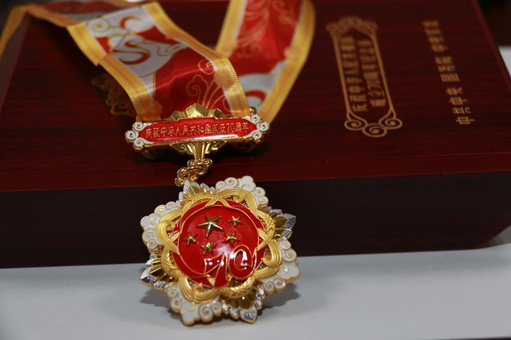 “庆祝中华人民共和国成立70周年”纪念章使用铜胎镀金材质,通径为50毫米,主要元素为五星、“70”飘带、团锦结、如意祥云和光芒,主色调为红色和金色,核心部分为五星,代表国家荣誉;“70”飘带象征中华人民共和国70年奋斗历程;团锦结环绕在五星和“70”飘带周围,寓意全国各族人民大团结,构建人类命运共同体的愿景;章体外环以如意祥云、光芒构成,象征人民对美好生活的向往,同时表达隆重庆祝中华人民共和国生日,礼赞国家富强、民族振兴、人民幸福的辉煌成就,以及在70年辉煌奋斗成就的基础上不忘初心、继续前进的坚定决心。(撰稿:唐洪伟、刘红艳,摄影:陈浩青,审核:金建英、赵雷)