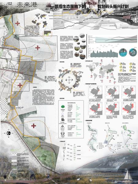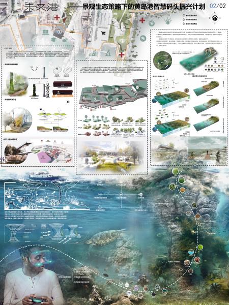 其中,课程设计类一等奖作品《未来港——景观生态策略下的黄岛港智慧码头振兴计划》,通过对场地现状的分析以及参考“智慧城市”的相关先进理念,提出了“智慧码头”“未来港口”的创新性理念。通过借助VR技术、AR技术、全息投影技术、边缘消隐等先进技术进行融合与利用,最终形成一处以高科技技术体验为主要形态,新型旅游产业、航运产业为基础产业,特色商业、后工业遗址公园与生态体验公园为主要特色的黄岛港智慧码头振兴。在评选过程中,该作品以切合实际的设计理念和优秀的方案成果得到了大赛评委的一致认可。