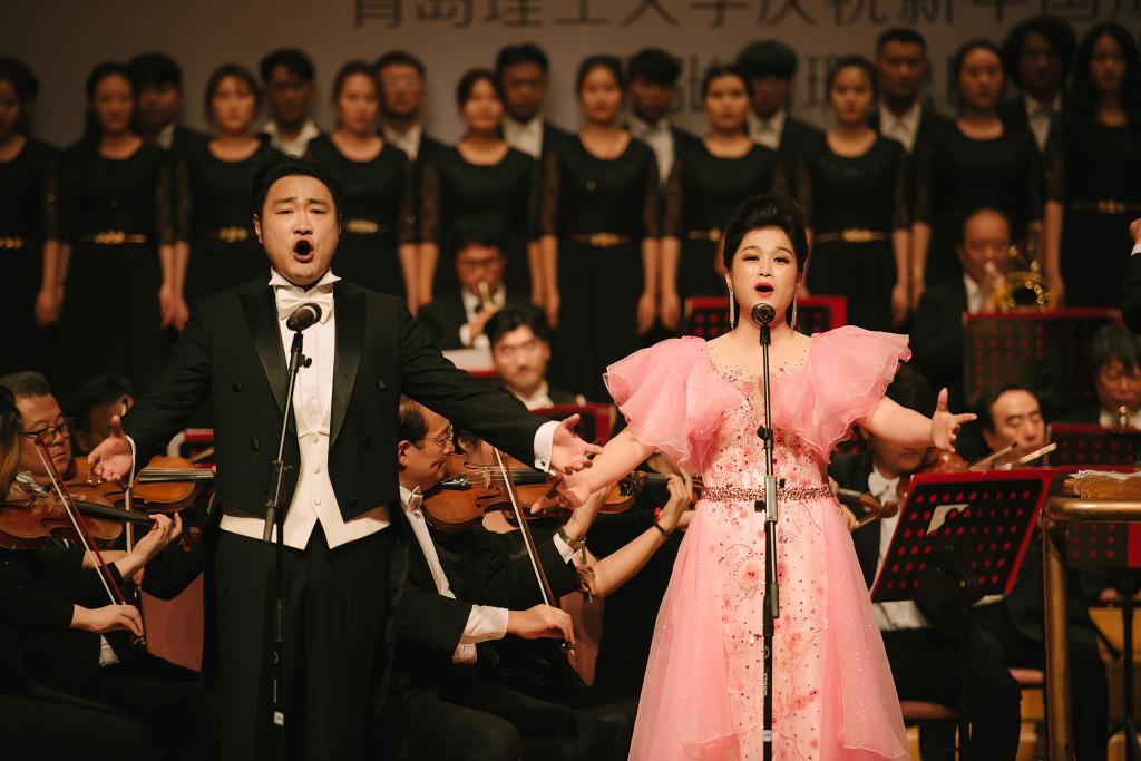 “我们实现伟大的复兴,旭日更喷薄……”音乐会精心选取了12首深受广大师生喜爱的爱国主题歌曲,让爱国旋律在师生心中奏响,也为师生带来一场精彩生动的爱国主义教育课。《多想对你说》《江山》大气磅礴真诚质朴,反映展现了中国梦的波澜壮阔和中国共产党“以人为本、执政为民”的理念;《在希望的田野上》《报答》行云流水荡气回肠,深切表达了对家乡、对祖国的热爱和祝福。《浏阳河》《龙船调》《玛依拉变奏曲》经典民歌脍炙人口,《芦花》《玫瑰三愿》意境深远委婉动听,《我的深情为你守候》《我的爱将与你相伴终生》深沉执着隽永动人,从不同侧面歌颂伟大祖国的大好河山,歌颂新时代春潮涌动的蓬勃景象。作为演出嘉宾,艺术与设计学院青年教师张蕊蕊现场演奏二胡协奏曲《沂蒙随想》,青年教师韩凯合唱了《我的深情为你守候》。青岛音乐厅交响乐团应邀现场伴奏并演奏中国传统曲目《茉莉花》,青年指挥家贾巍全程“执棒”,365完美体育伯牙学生室内合唱团伴唱。音乐会在台上歌唱、台下应和的一首《我和我的祖国》中落下帷幕。