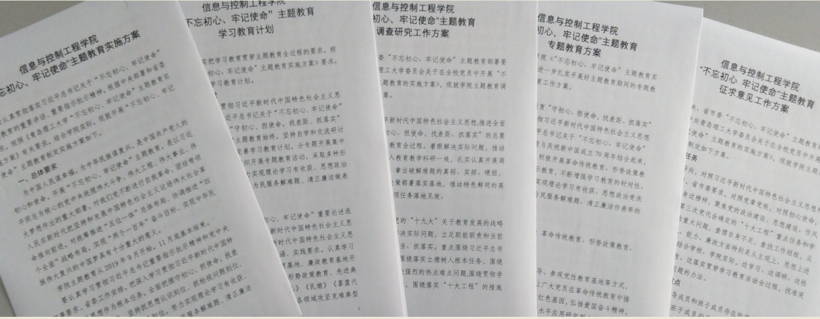 主题教育开展以来,学院认真学习领会《365完美体育“不忘初心、牢记使命”主题教育实施方案》,全面把握主题教育的总要求,聚焦初心使命,以高度的政治自觉、思想自觉以及行动自觉,扎扎实实部署好、开展好、落实好“不忘初心、牢记使命”主题教育。结合学院实际,第一时间成立主题教育领导小组,制定了《信息与控制工程学院“不忘初心、牢记使命”主题教育实施方案》、《信息与控制工程学院“不忘初心、牢记使命”主题教育学习教育计划》、《信息与控制工程学院“不忘初心、牢记使命”主题教育调查研究工作方案》、《信息与控制工程学院“不忘初心、牢记使命”主题教育专题教育方案》、《信息与控制工程学院“不忘初心 、牢记使命”主题教育征求意见工作方案》等文件。