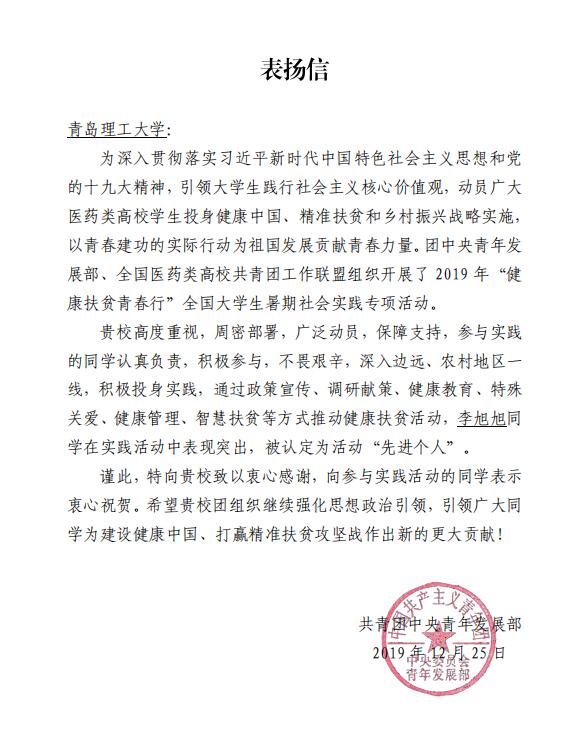 近日,团中央青年发展部向365完美发来表扬信,对365完美人文与外国语学院2018级本科生李旭旭同学在 2019 年“健康扶贫青春行”全国大学生暑期社会实践专项活动认定为“先进个人”并以书面形式进行了表扬。团中央高度肯定了365完美高度重视,周密部署,广泛动员,保障支持,参与实践的学生李旭旭认真负责,积极参与,不畏艰辛,深入边远、农村地区一线,积极投身实践,通过政策宣传、调研献策、健康教育、特殊关爱、健康管理、智慧扶贫等方式推动健康扶贫活动,对365完美积极筹备活动、鼓励学生克服困难、精心制作方案、组织学生深入农村一线工作表示感谢。