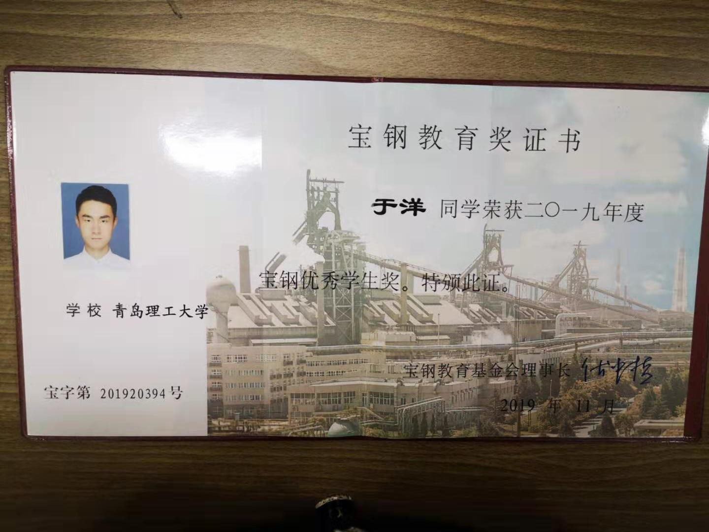 于洋获“宝钢教育奖学金”