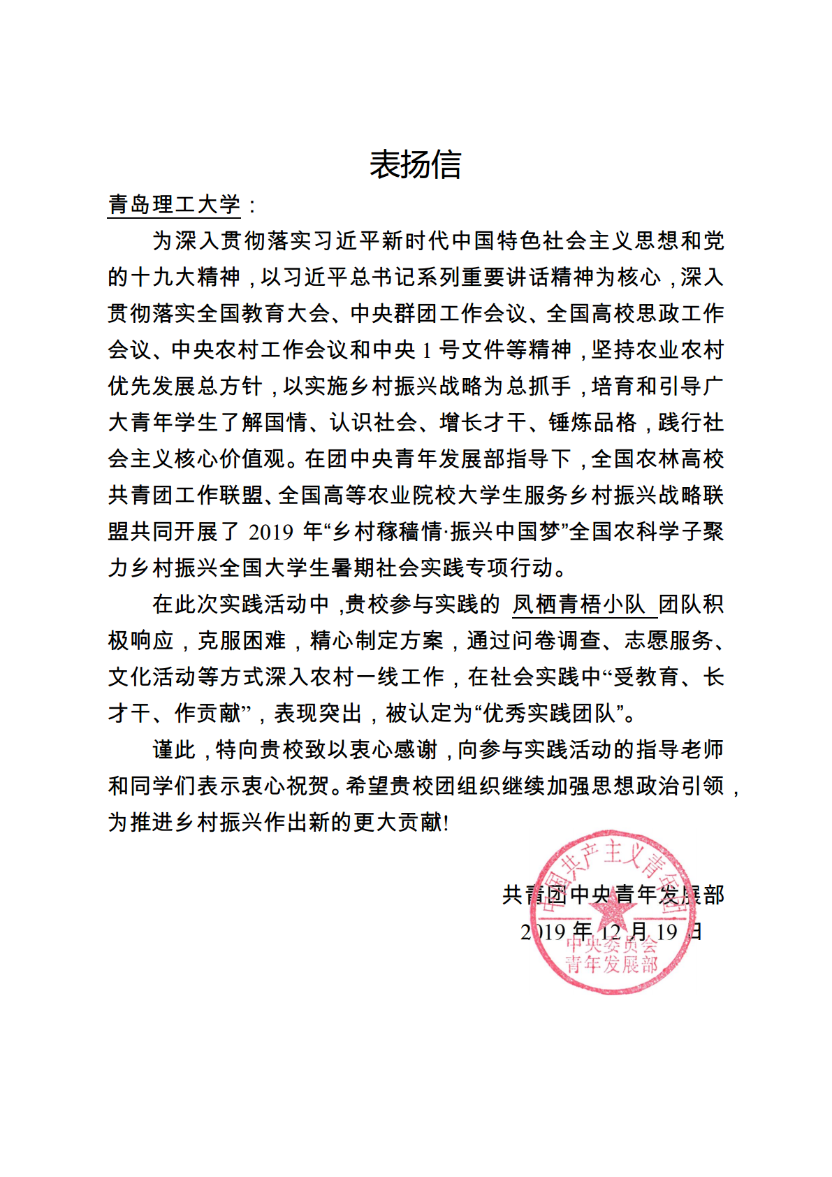 “凤栖青梧小队”团队获得团中央青年发展部书面表扬
