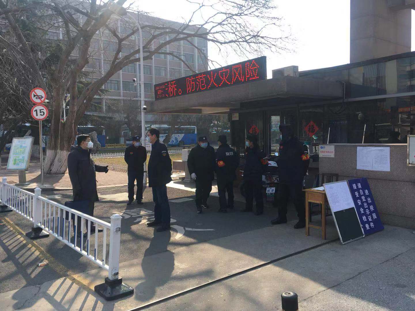 校领导一行先后逐校区实地查看了校门封闭管理、校园与家属区分隔管理、校医院值班值守以及公共区域日常消杀等防疫工作落实情况。在各校区校门门岗处,查看了校门值班管理、进出人员体温监测及记录登记情况;在校医院,看望慰问了值班医护人员,查看了人员就诊登记情况,询问了防控物资储备情况。