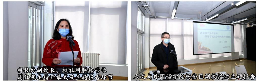 研讨会上首先由人文与外国语学院学术委员会主任、硕士生导师、社会学组组长杨奎臣副教授做“落实四中全会精神 推进市域社会治理现代化研究”主题报告,内容包括四个部分:四中全会关于社会治理的新表述、新时代社会治理创新的新方向、市域社会治理现代化新路径、研究基础与初步建议。