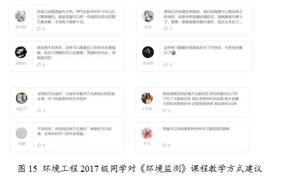教学过程的评价是双向的。对于学生,直接考察课堂的互动情况(预习、签到、抢答、投票等)以及对知识的掌握和应用(作业、调查报告、课堂分享等),开展作业“互评”模式;而对于教师,不仅“教书”,还有“育人”,则是考察学生通过你的课程在知识、能力以及做人等方面有了怎样的提升,总的说来,二者是相辅相成的。