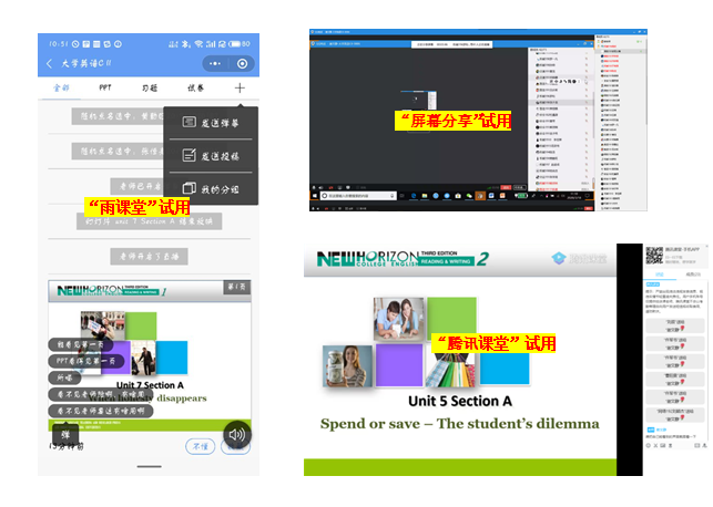 如何让课堂教学有效性更高,取得更好的教学效果?选择适合师生“教”与“学”的教学方式十分重要。从QQ群课堂、QQ屏幕分享、腾讯课堂、腾讯会议到雨课堂、智慧树、钉钉等平台,大学英语教师们对尽可能多的在线教学方式开展了反复试验,并在群组内就每个平台的优势和特点进行了分享和交流,共同熟悉和掌握平台能够提供的教学功能,思考常用的课堂教法在现有的技术条件下能否开展、如何开展。