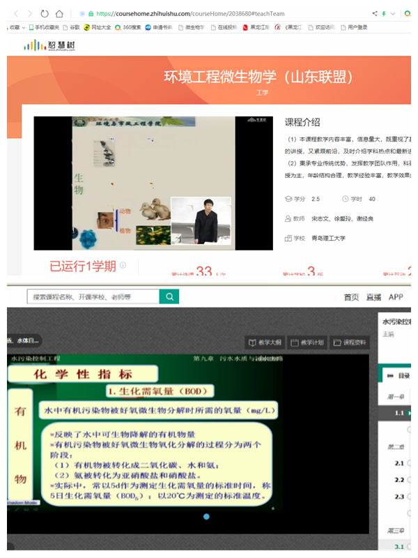 宋志文教授承担的《环境工程微生物学》、王娟教授承担的《水污染控制技术》等课程通过在智慧树网站建设共享课程(录制视频上挂、视频弹幕出题、每章节出5道以上练习题、3道讨论题、120道以上习题库)、翻转课堂(上传PPT课件、发布练习题)、QQ答疑等形式,充分调动学生们的积极性,并及时掌握学生的出勤、答题、学习时长、知识点的掌握程度等。