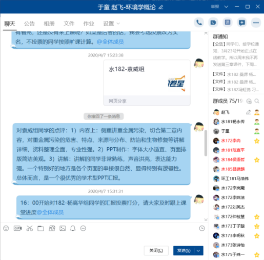 对于在线课堂人数较多的课程,如《环境学概论》,采取了小组PPT汇报的形式,由小组集体制作、选派2-3名代表讲解,对参加讲解的同学的平时成绩额外加分,以此调动学生学习主动性。对于网络质量不佳的同学,采取直接发送录播视频的方式,保证学习效果。