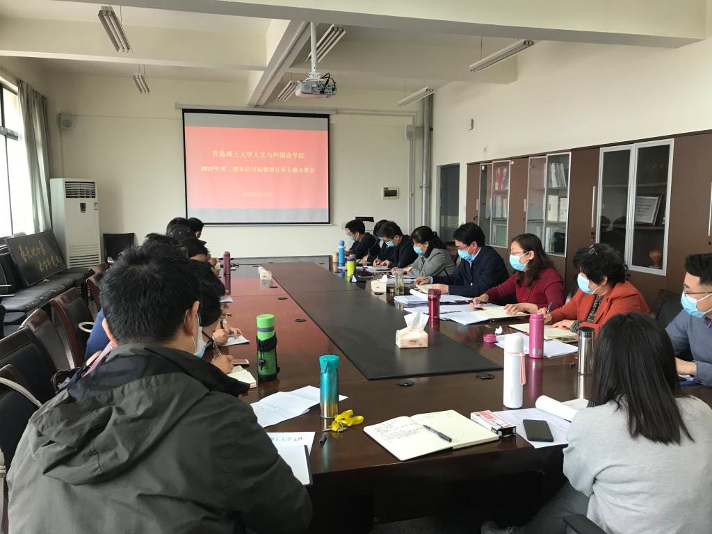 巩湘红传达了学校2020年度二级单位目标管理任务书签约大会会议精神,介绍了学校目标管理工作有关情况及具体要求,强调了工作的必要性和紧迫性。并就二级单位目标管理任务分解工作进行了落实部署。巩湘红表示,学院领导班子根据目标责任书内容进行了认真思考和筹划,按照学校绘出的“路线图”,排出了“时间表”,列出了“关键点”,细化了“施工图”。现需要将规划落到实处,将计划变成现实,希望各教研室按照目标任务分解表,充分调动全体老师以高度的主人翁精神和责任感扎实干事,以实际行动为学院学科建设和各项事业发展做贡献,尽全力把2020年的目标任务落实好、实现好。