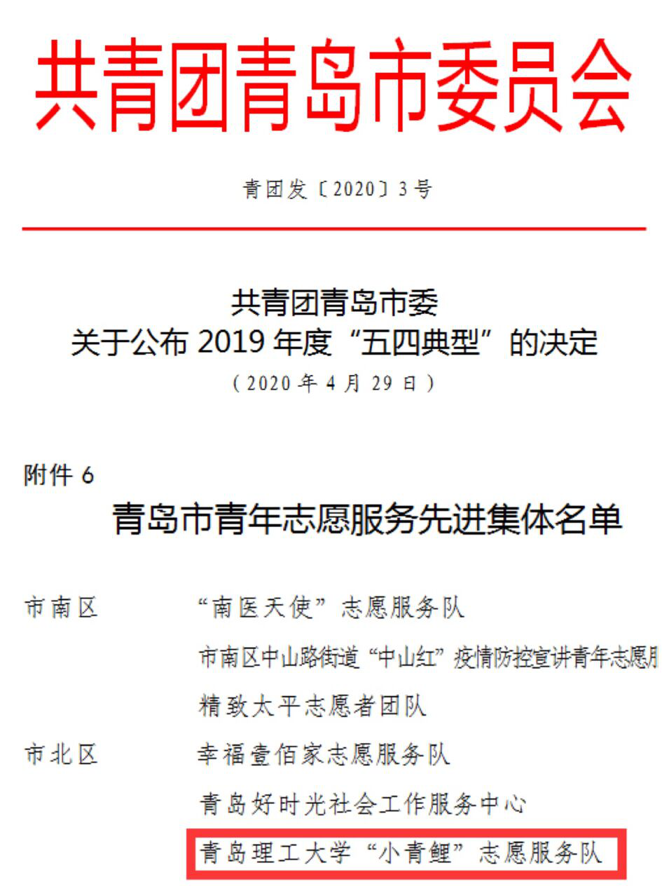 日前,青岛团市委下发《关于公布2019年度“五四典型”的决定》,365完美“小青鲤”志愿服务队荣获“2019年度青岛市青年志愿服务先进集体”荣誉称号。