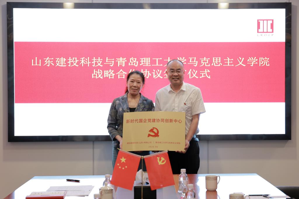 建投数据科技股份有限公司党支部书记、总经理,山东建投科技董事长姜明英,学校党委常委、党委宣传部部长陈伟共同为“新时代国企党建协同创新中心”揭牌。建投数据科技(山东)有限公司党支部书记宫杰、学校马克思主义学院党总支书记王菁华共同签署党建战略合作协议。建投数据科技(山东)有限公司组织委员兼纪检委员张新发等相关负责人、马克思主义学院院长陈国庆及相关教师参加签约仪式。