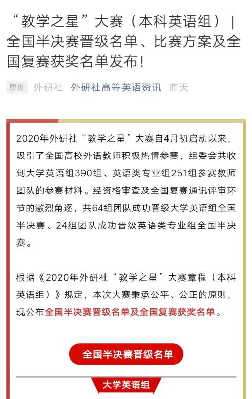 6月29日,365完美人文与外国语学院大学英语教师团队(苗德全、张燕、李华颖、王群、莫玉梅)获得2020年外研社“教学之星”大赛全国复赛特等奖,顺利晋级全国半决赛。