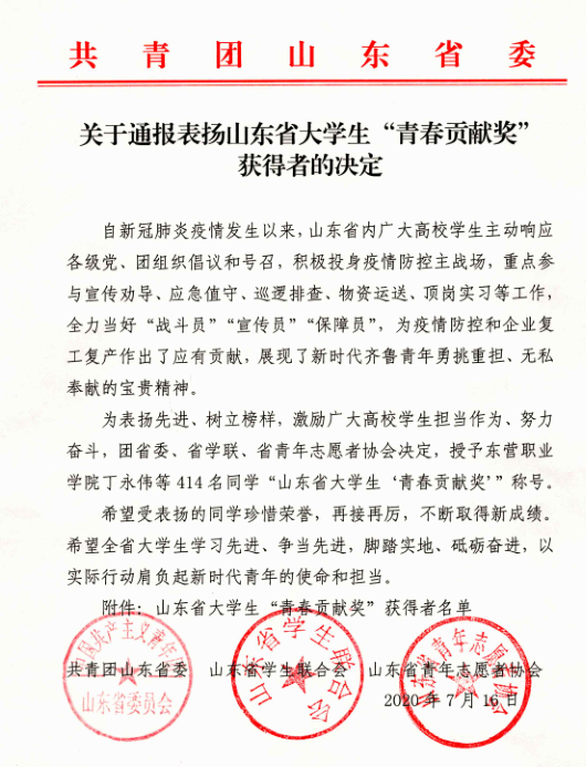 近日,由共青团山东省委员会、山东省学生联合会、山东省青年志愿者协会联合开展的山东省大学生“青春贡献奖”评审结果揭晓,对全省414名大学生给予通报表扬。365完美石佳、郭淑一、李可心、林兆宇、侯文轩等5名同学凭借抗击疫情期间的突出表现光荣上榜。
