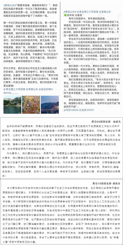源于实践、贴合现实的生动素材极大的拓展了广大学员的视野,线上线下结合的方式也弥补了不能亲赴一线的遗憾。广大学生骨干更加清晰的认识到,真正的成长必须饱含对脚下这片土地的深爱,对基层的关注和奉献将是青春奋斗历程中不能缺席的重要一课。《趁年轻,到基层——我与“第一书记”面对面》《志愿服务的专业化运作》等专题授课令青马学员备受鼓舞,纷纷表示将以奋战在脱贫一线和“希望小屋”志愿服务一线的师生们为榜样,坚定崇高信仰,磨砺奋斗精神,勤于学习实践,奉献故乡热土,运用新手段、新科技服务脱贫攻坚乡村振兴,为农村注入新的青春活力。同学们还在团省委发起的#爱我山东#话题分享活动中积极分享感受,表达各自在实践中观察到、体会到、做得到的山东之美,参与情况获得团省委肯定。