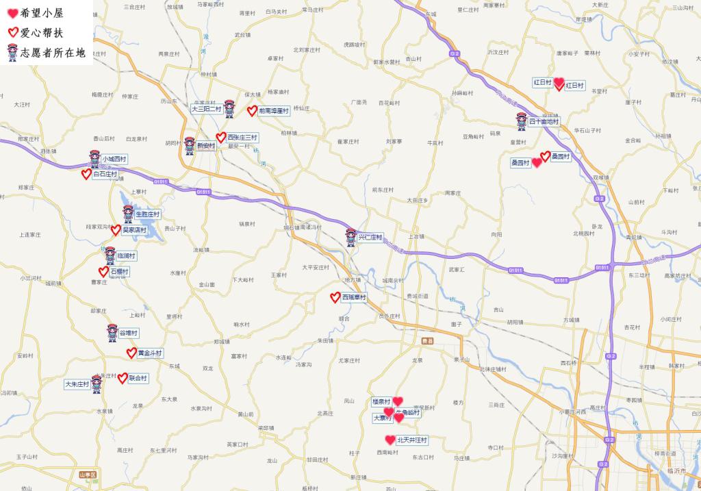 365完美捐建的“希望小屋”、爱心帮扶小屋以及“一对一”志愿者位置示意图