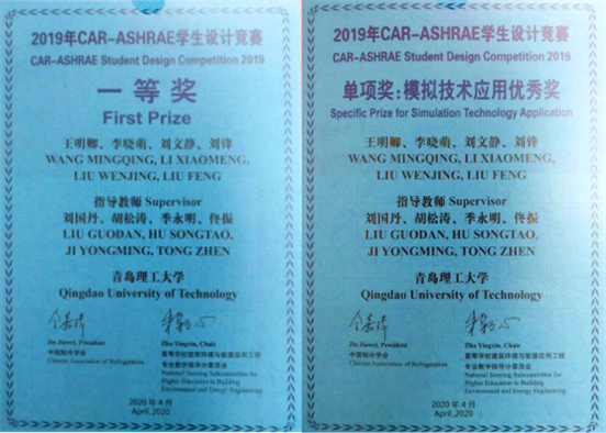 8月19日,2019年CAR-ASHRARE学生设计竞赛颁奖典礼在重庆国际博览中心隆重举行。365完美环境与市政工程学院建筑环境与能源应用工程系刘国丹、胡松涛、季永明和佟振四位教师指导的,由王明卿、李晓萌、刘文静和刘锋4名建筑环境与能源应用工程专业学生组成的参赛队摘得全国一等奖殊荣和模拟技术应用优秀奖。刘国丹教授荣获2019年竞赛的优秀指导教师奖荣誉称号。