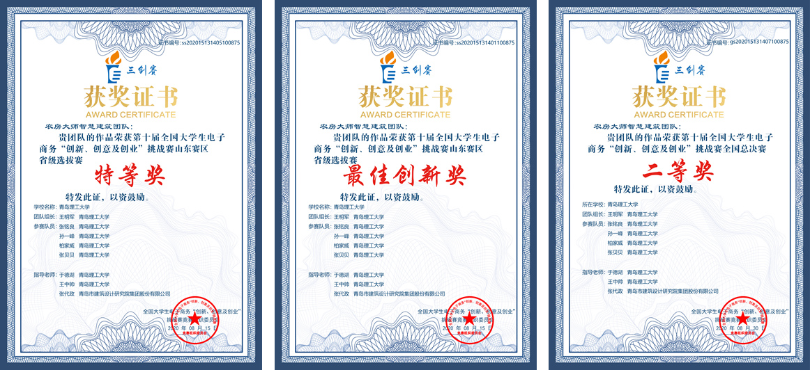 全国大学生电子商务“创新、创意及创业”挑战赛旨在激发大学生兴趣与潜能,培养大学生创新意识、创意思维、创业能力以及团队协同实战精神的全国性竞赛。此次比赛历时9个月,全国共有32万学生、65119支队伍报名参赛。鉴于新冠肺炎疫情影响,大赛各级决赛均采用线上与线下相结合的方式举办,即参赛选手线上路演,评委线下打分。在山东财经大学举办的山东赛区选拔赛中,土木工程学院“农房大师智慧建筑团队”(队员:王明军、张铭良、孙一峰、柏家威、张贝贝,指导老师:于德湖、王中帅)以总分全省第五、创新分单项最高的成绩夺得山东省特等奖、最佳创新奖,并获推至全国总决赛。在全国总决赛路演环节,来自全国31个省、市、自治区以及香港特区、澳门特区选拔出的167支优秀参赛团队通过网络平台参加答辩。同时,来自教育部电商教育指导委员会、国内各知名高校、优秀企业的90多位专家评委,在河南科技大学进行集中在线评审。经过两天激烈的角逐,最终团队获得二等奖。