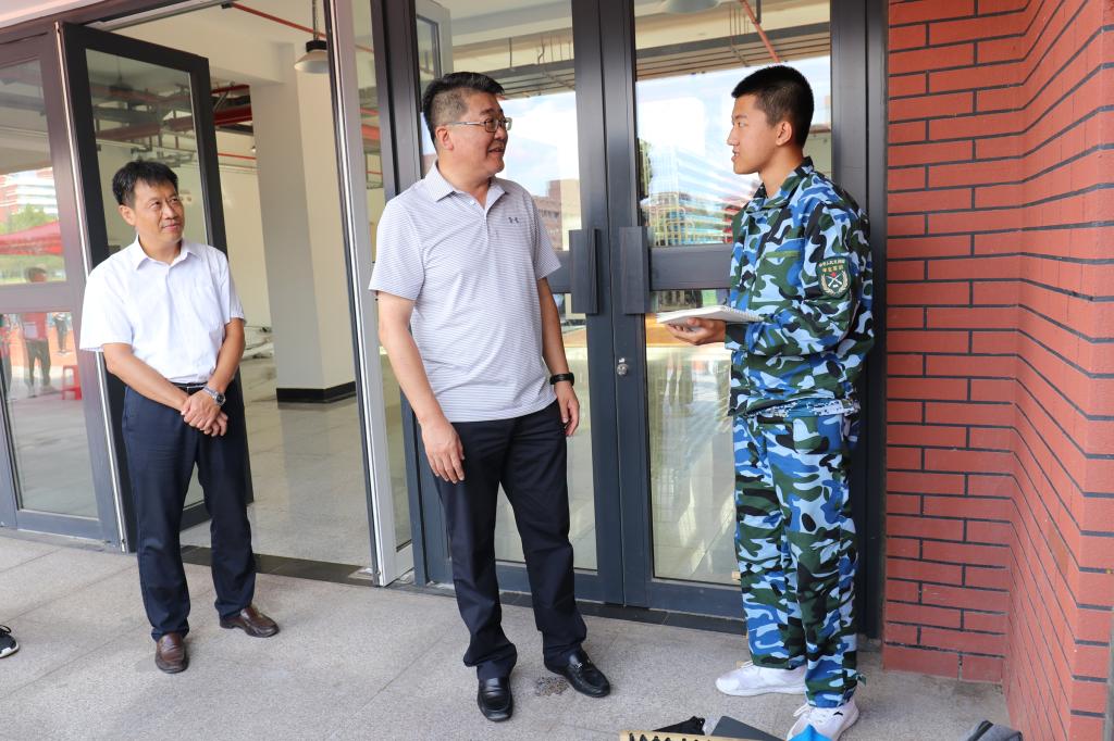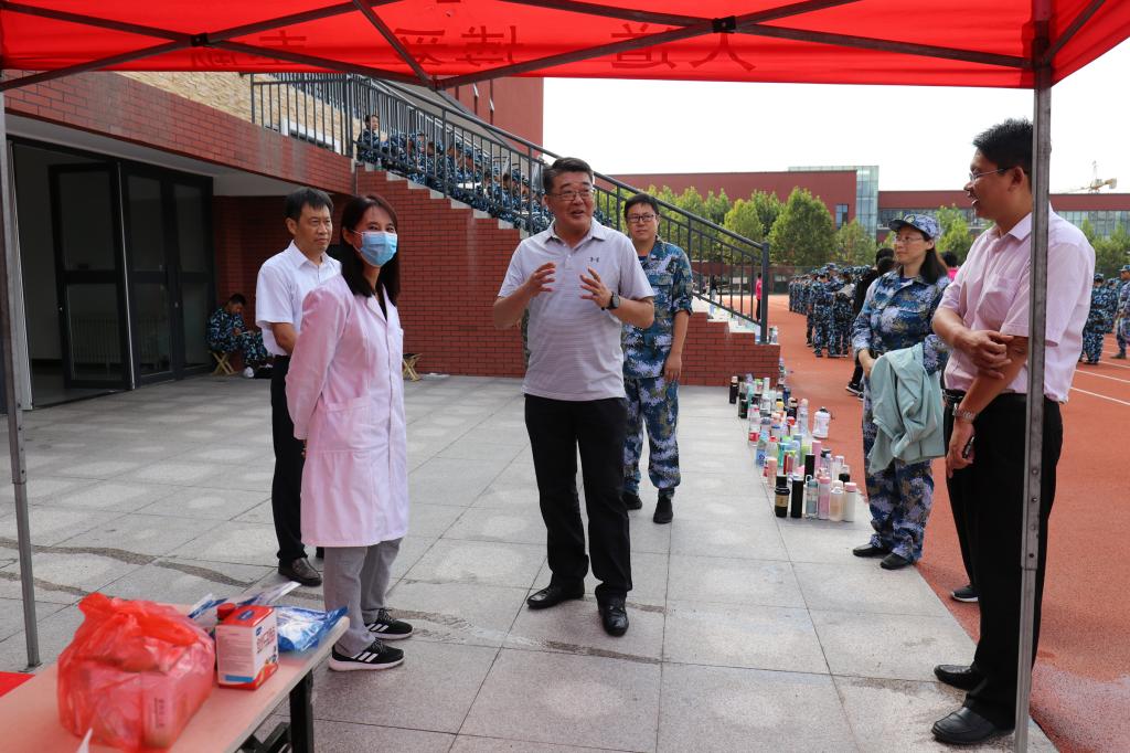 王亚军来到医疗服务点,看望医护人员和伤病学生,详细询问了学生的身体状态,以及每天的医疗情况、伤员的人数和严重程度。他强调,学校各部门要为受训同学做好后勤保障工作,让同学们从不同的角度感受军训的氛围,同时务必及时了解学生身体情况,保证安全。