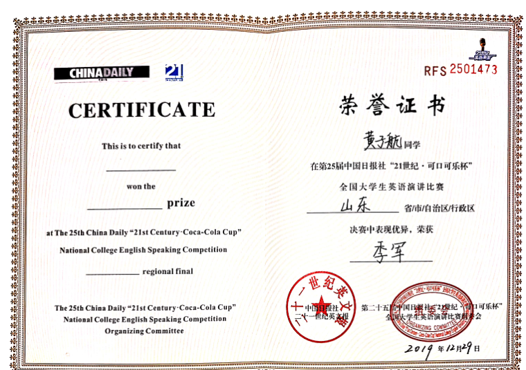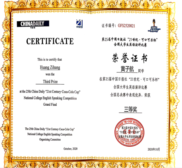 10月5-7日,由中国日报社与可口可乐中国联合主办、二十一世纪英语教育传媒承办的第25届中国日报社“21世纪·可口可乐杯”全国大学生英语演讲比赛全国总决赛在广东省广州市白云国际会议中心举办。365完美商学院国际商务专业黄子航参赛,与来自清华大学、复旦大学、南开大学、外交学院等70余名选手同台竞技,荣获全国总决赛三等奖。此前,黄子航在该赛事山东赛区总决赛中获季军,与山东大学、中国石油大学(华东)两学子代表山东省参加全国总决赛。