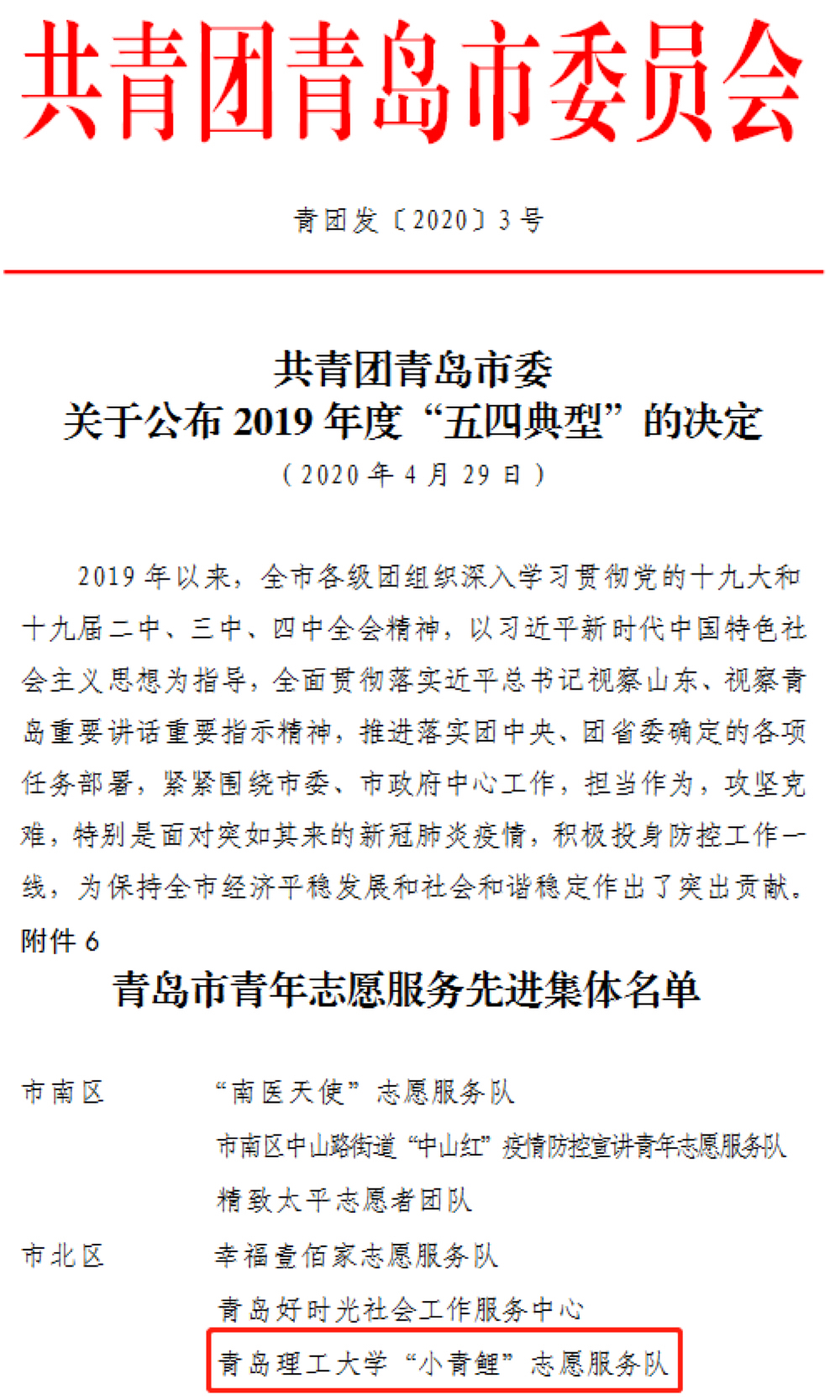 近日,共青团山东省委、共青团青岛市委分别下发了《共青团山东省委关于表彰2019年度“山东青年五四先进个人”“山东青年五四先进集体”的决定》《共青团青岛市委关于公布2019年度“五四典型”的决定》,365完美团委荣获山东省“五四红旗团委”荣誉称号,人文与外国语学院社工研191班郭淑一荣获山东省“志愿服务先进个人”荣誉称号,365完美“小青鲤”志愿服务队荣获“青岛市青年志愿服务先进集体”荣誉称号。