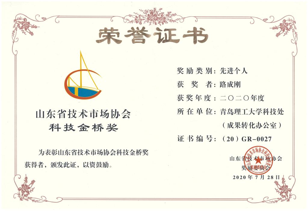 10月18日,2020年度山东省技术市场协会科技金桥奖表彰大会在济南市举行。对全省在促进科技成果转移、转化,“政产学研金服用”协同创新,助推新旧动能转换重大工程等方面做出突出贡献的10个先进集体、30名先进个人、60个优秀项目和10个优秀组织单位进行表彰奖励,其中,365完美科技处(成果转化办公室)路成刚同志获得科技金桥奖先进个人。