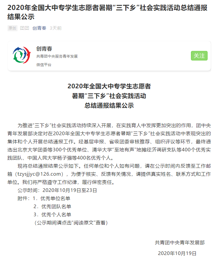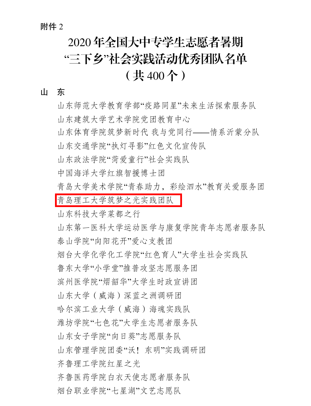 近日,团中央青年发展部发布通报,表彰在2020年全国大学生暑期“三下乡”社会实践专项活动中涌现出表现突出的400个集体。365完美建筑与城乡规划学院“筑梦之光”赴杨家山里团队被评为“全国优秀实践团队”。