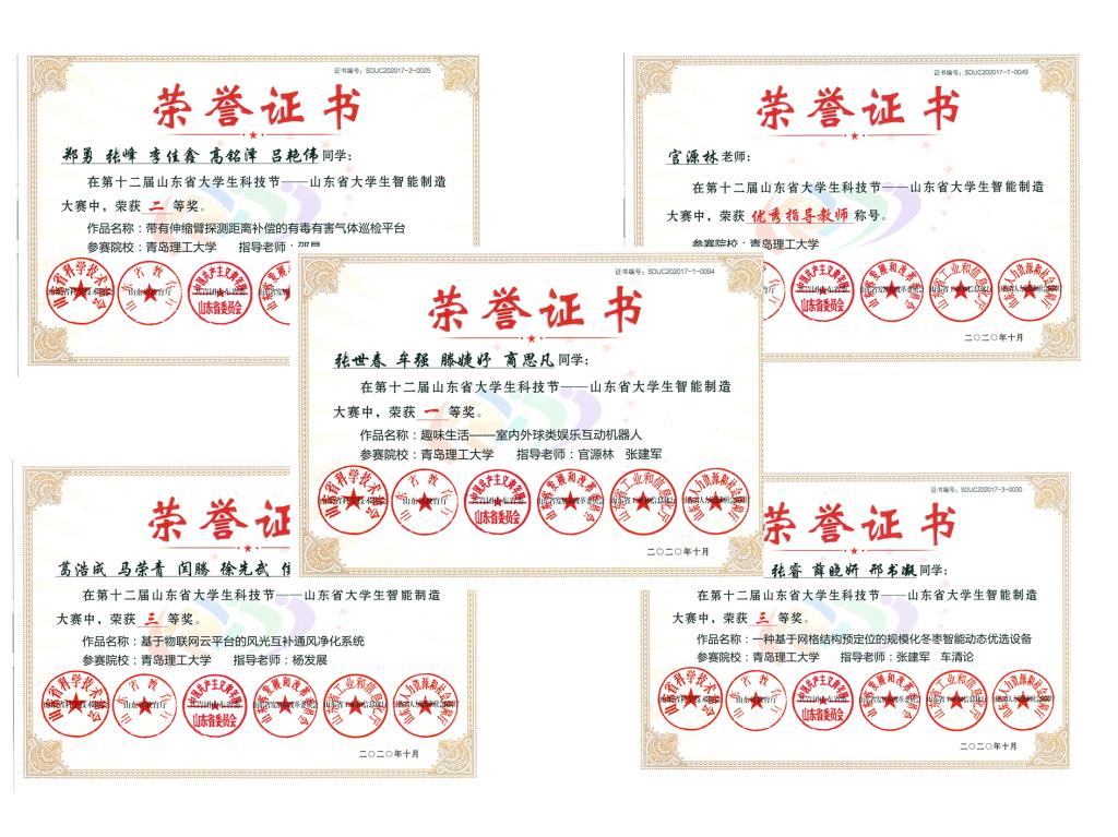 近日,由山东省科协、省教育厅、团省委、省发展改革委、省工业和信息化厅和省人力资源和社会保障厅联合举办的山东省大学生智能制造大赛于线上成功举行。365完美机械与汽车工程学院选派的4件作品全部进入决赛,其中作品“趣味生活-室内外球类娱乐互动机器人”(参赛者:张世春、牟强、滕婕妤、尚思凡,指导老师:官源林、张建军)获一等奖;作品“带有伸缩臂探测距离补偿的有毒有害气体巡检平台”(参赛者:郑勇、张峰、李佳鑫、高铭泽、吕艳伟,指导老师:邵晶)获得二等奖;作品“基于物联网云平台的风光互补通风净化系统”(参赛者:葛浩成、马荣青、闫腾、徐先武、侯贵捷,指导老师:杨发展)、“一种基于网格结构预定位的规模化冬枣智能动态优选设备”(参赛者:王郑扬、冯日、张睿、薛晓妍、邢书凝,指导老师:张建军、车清论)获得三等奖。官源林老师获“优秀指导教师”称号。