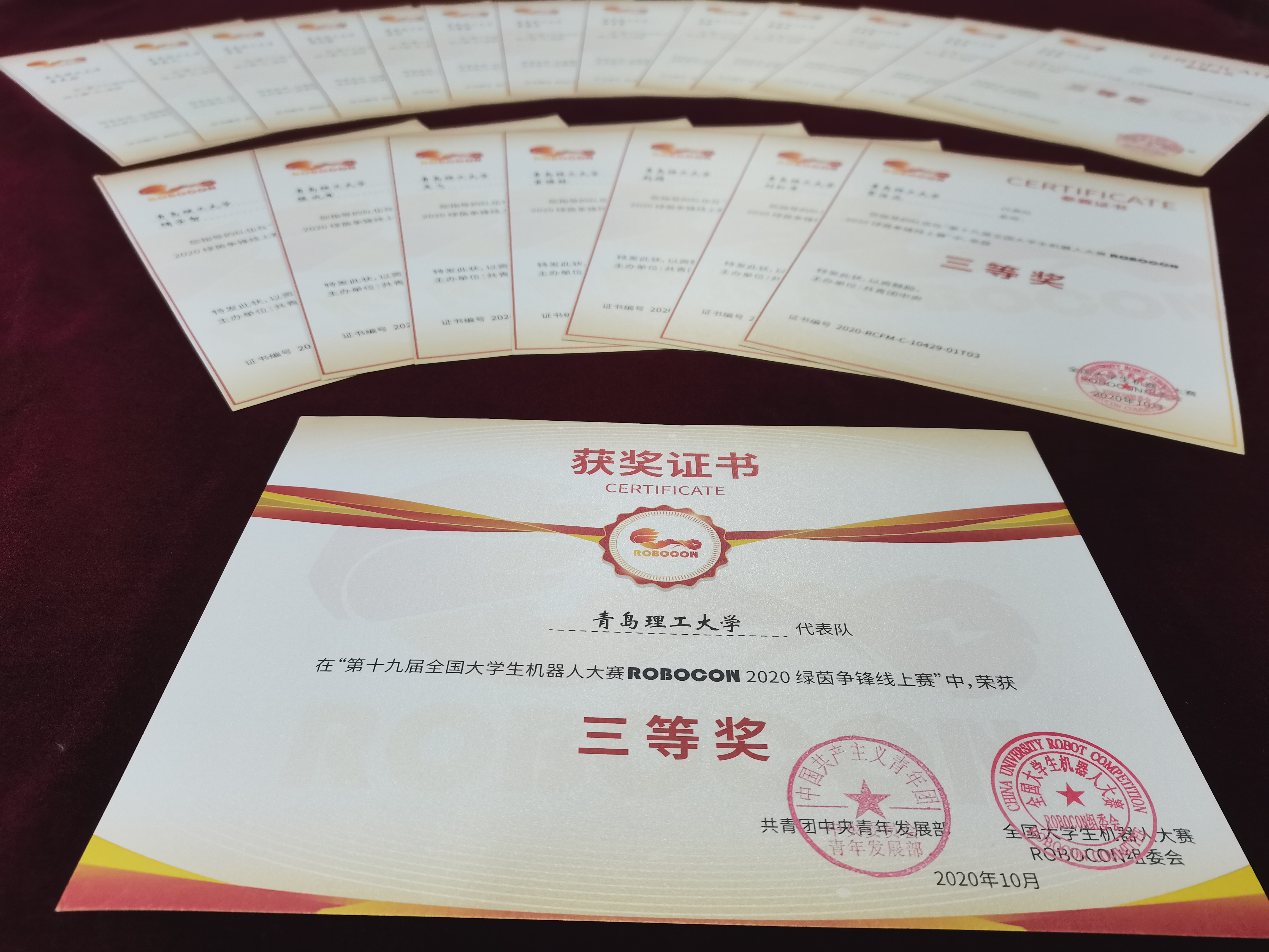 受疫情影响,本届赛事选择线上各高校现场直播的形式参赛。本届ROBOCON 大赛以“绿茵争锋”为主题,吸引了包括武汉大学、哈尔滨工业大学、西安交通大学、北京航空航天大学、东北大学、电子科技大学等全国 81 所高校报名参赛。团队在机械、材料和测控等专业老师的技术指导下,由机械、车辆、材料、测控、通信、财务管理、造价工程等专业学生组成,经过十个月制作和备战,在学校各部门大力支持下,自制机器人顺利完成规则设置的任务,获得总分93分(满分100)、总时间分:255分的好成绩,时间分作为参赛高校机器人灵活度、实力最主要的表征,团队时间分成绩位列省内第三。