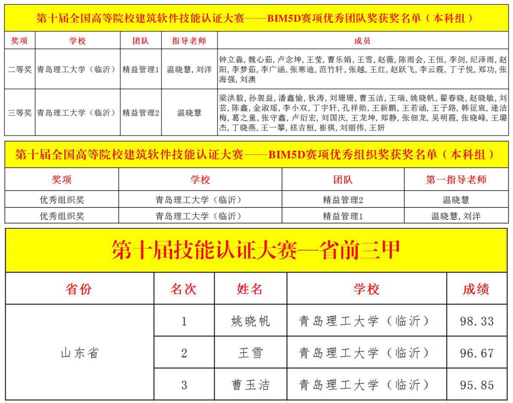 本次比赛自9月份启动以来,临沂校区高度重视、积极备赛,经过线下线上长达两个月的BIM5D软件技能培训,两次线上模考,最终选派的2支队伍、61名同学代表校区参加决赛,决赛为线上团体赛,每个团队要求20人以上参加,在教师温晓慧、刘洋悉心指导下,参赛队员团结努力、奋勇争先,通过BIM5D软件完成认证比赛操作任务,最终“精益管理1”团队获得本科组二等奖、优秀组织奖;“精益管理2”团队荣获本科组三等奖、优秀组织奖;姚晓帆、王雪、曹玉洁3名同学获得山东省个人前三名;61名参赛选手均获得BIM5D软件“熟手级”认证。