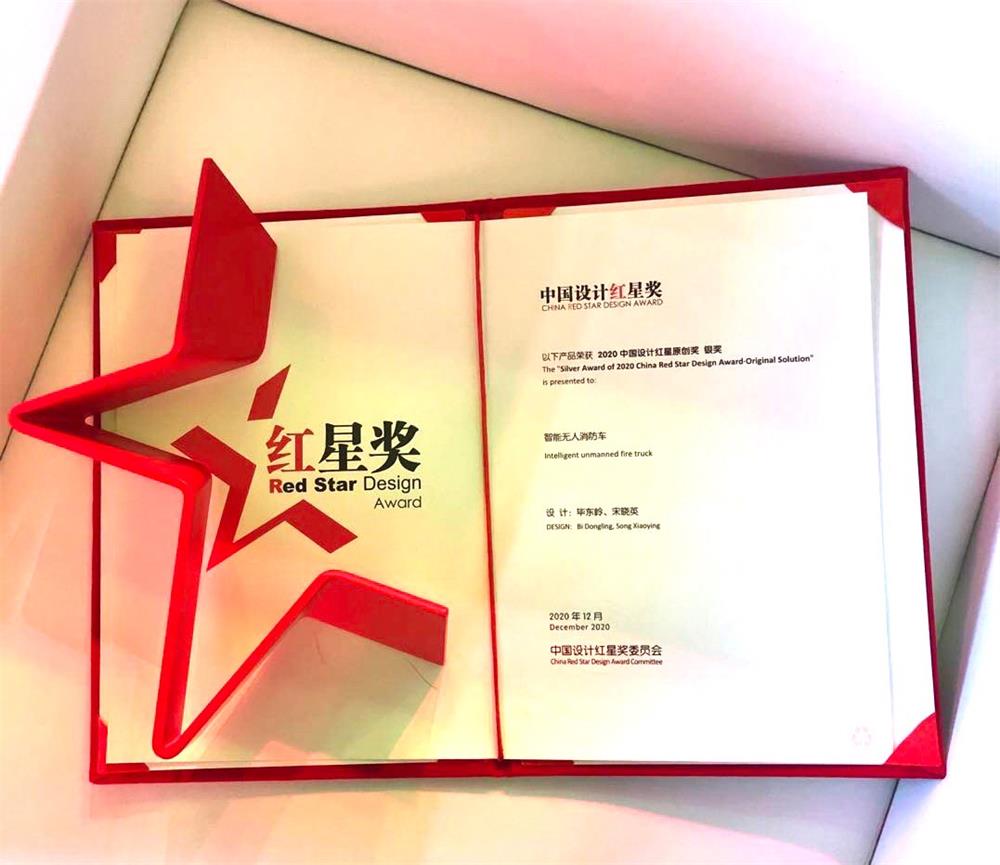 中国设计红星奖作为北京市科委支持的专业设计奖项,于2006年由中国工业设计协会、北京工业设计促进中心共同发起创立。自创立起围绕建设创新型国家的战略目标,秉持“公平、公正、公益、高水平、国际化”的办奖原则,成为目前国内最权威、影响力最大的设计奖项,被中央电视台誉为“中国唯一具有国际影响力的设计奖”。本届红星奖以“融合的时代 凝聚的力量”为主题,共征集到全球5000余家单位超过7000件参评产(作)品,包括中车、华为、阿里巴巴、联想、小米、德国西门子、日本松下等国内外知名企业积极报送的最新产品,经由中国、德国、法国和美国的40余位中外专家评委评审,评选出金奖11项、银奖15项等奖项,其中,原创组金奖2项、银奖5项。《智能无人消防车》凭借新颖的设计理念、前瞻性的概念设计获得评委一致青睐,一举拿下2020中国设计红星奖原创奖银奖。
